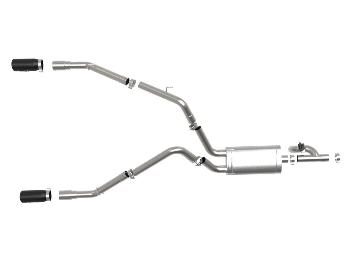 System wykończony jest podwójnymi końcówkami o średnicy 5″, wykonanymi z czarnej stali nierdzewnej, montowanymi za pomocą zacisków. Na końcówkach znajduje się nitowana tabliczka z logo aFe POWER, nadająca im unikalny styl.