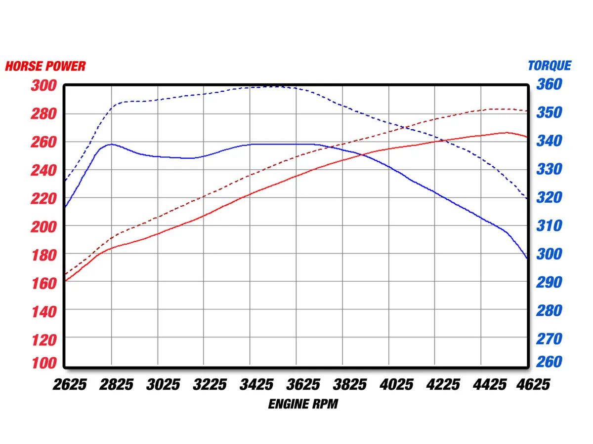 Ten system dolotowy Stage-2 wykorzystuje rurę dolotową o średnicy 3,5 cala, wykonaną z aluminium pokrytego czarną powłoką proszkową, oraz masywny filtr powietrza Pro 5R o średnicy 5,5 cala. Prosta obudowa zatrzaskowa korzysta z fabrycznej dolnej obudowy filtra powietrza, co zapewnia łatwy montaż. Adapter trójkątny przyspiesza przepływ powietrza za filtrem, poprawiając osiągi i reakcję przepustnicy. Wszystko to razem daje przyrosty do +18 KM, +23 lb-ft momentu obrotowego i przepływ większy o 27% w porównaniu do fabrycznego dolotu.